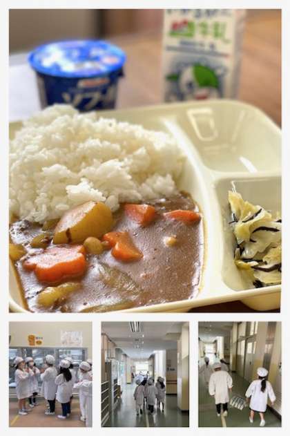カレーライスには、時々花形のニンジンが混ざっています。これは「ラッキーにんじん」といって、給食調理員が子どもたちを楽しませるためにしている工夫です。