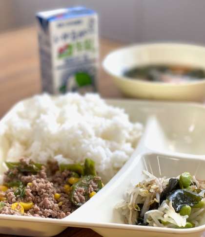 3色丼は、牛ひき肉・豚ひき肉・ピーマン・コーンを具材に使い、ほんのりしょうがの香りがします。