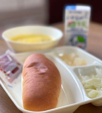 給食で提供しているパンは、その日の朝に焼き上げた鮮度の高いもので、合成保存料などは使っていません。ふっくら美味しいコッペパンは、いろいろな味付けによく合います。