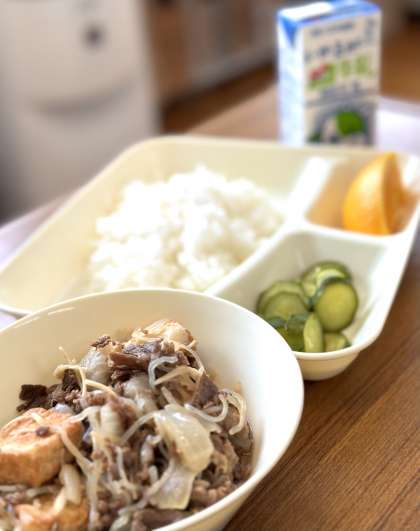 今日の献立は【すき焼き煮、きゅうりのしょうがづけ、オレンジ、ごはん、牛乳】です。
