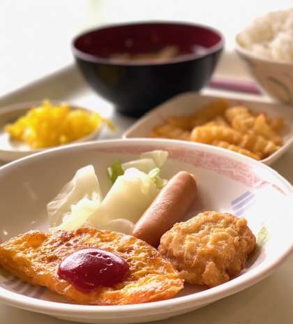 臨海2日目の朝食は【ミートオムレツ・チキンナゲット・フライドポテト・ウインナー・漬物・ごはん・みそ汁】です。