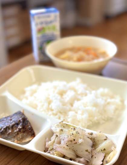 6月8日の献立は【さごしのつけ焼き、みそ汁、キャベツの赤じそあえ、ご飯、牛乳】です。