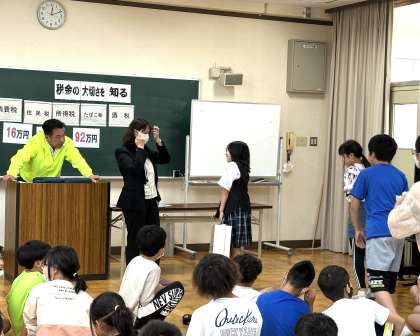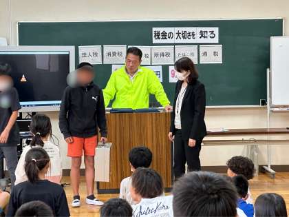 税金がどうして大切なのかということ、現在は50種類ほどあること、小学生ひとりあたりにかかる教育(税金)は約92万円かかっているということなどの税金クイズなど、子どもたちの身近な内容で税金について教わりました。また、ケースに入った「1億円」を持たせていただく体験もしました。