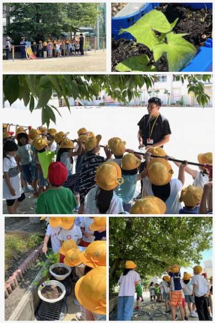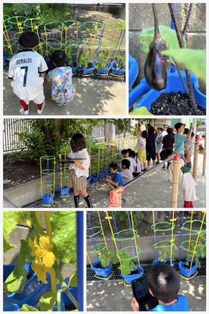 2年生は、キュウリ、ナス、ミニトマトを育てていますが、ナスは小さな実を、キュウリは黄色い花をつけている鉢がたくさんありました。