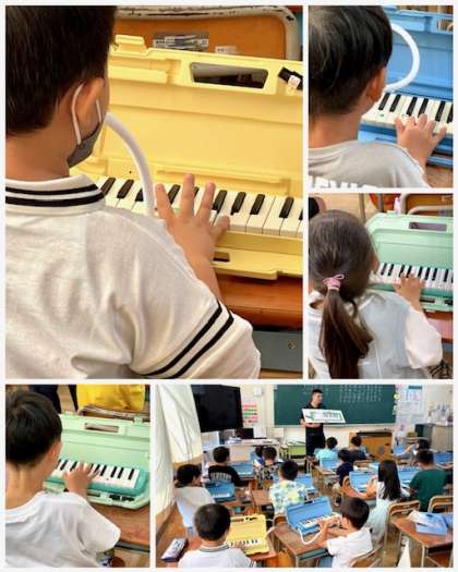 1年生は、けんハモ(鍵盤ハーモニカ)を使って音を出す練習をしていました。先生が大きな鍵盤の教材を使って、どこがどの音かを説明。それに合わせて音を鳴らします。音楽発表会には、どんな発表ができるようになっているか楽しみですね。