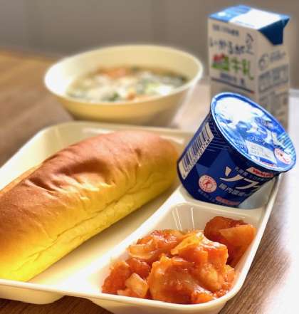 6/30の献立は【えびのチリソース・中華スープ・ヨーグルト・パンプキンパン・牛乳】です。今日は中華風の献立です。「えびのチリソース」は、豆板醤を使ったケチャップベースの味付けです。子どもたちが食べられるように辛さは控えめ。暑さが厳しい時期でも食が進む味付けです。