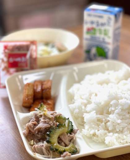 今日の献立は【ゴーヤチャンプルー・五目汁・あつあげのしょうがじょうゆかけ・ごはん・牛乳】です。