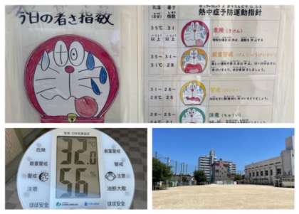 今日は、今年度に入って初めて「暑さ指数」が「危険」に達しました。11時に「危険」に達したので、その後は屋外の活動は控えています。