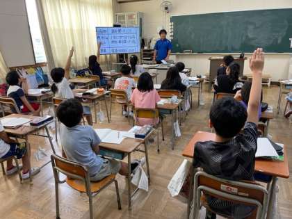 3年生は、社会科の時間に「買い物メモ」を見ながら学習を進めていました。「どんな店でどんな買い物をしたのか」を、買い物メモを見ながら分析します。スーパーマーケットや魚屋、八百屋といった専門店、100均のような生活雑貨の店など、いろいろな店があり、必要に応じて利用する店を選んでいることを学びました。