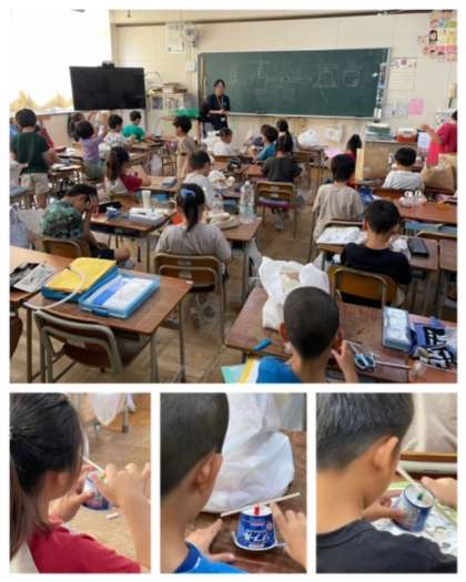 2年生は、カップや割りばし、ゴムを使っておもちゃ作りをしていました。子どもたちは工作が大好きですが、作ったものが動くとなると、楽しさはさらに倍増。夢中になって制作に取り組んでいました。