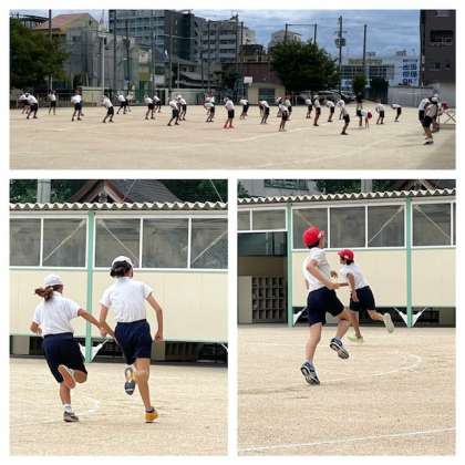 6年生は、運動会に向けて走力のチェック。短距離は春のスポーツテスト以来になるので、運動場を本気で一周走り、感覚を取り戻します。