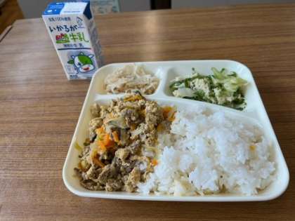 「他人丼」「ささみと野菜のいためもの」「もやしの甘酢あえ」「牛乳」でした。「ささみと野菜のいためもの」は、「ピーマン」と「キャベツ」が入っています。色がきれいで食が進みます。