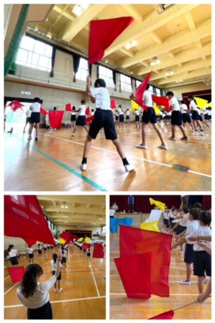 5・6年生は、今日も講堂でフラッグの演技の練習に励んでいました。毎回集中して取り組んでいるので、子どもたちの動きは短時間の練習とは思えないほどに揃っています。