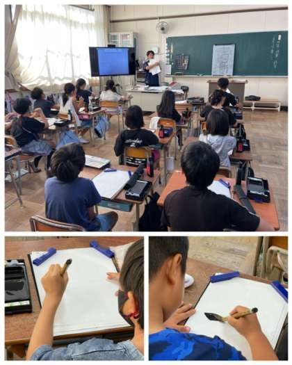 3年1組は、昨日習字の学習に取り組んでいました。習字道具の使い方は既に学習していましたが、この日は初めて「一」という字にチャレンジしました。単純な一本線ではなく、筆の動かし方を意識しながら書く必要があり、子どもたちは集中して取り組んでいました。