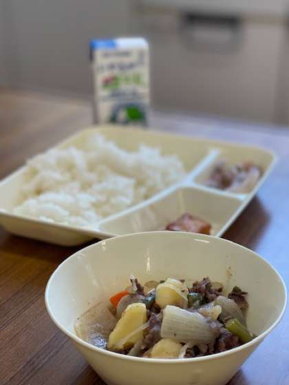 今日の献立は【肉じゃが・あつあげのみそだれかけ・キャベツの赤じそあえ・ごはん・牛乳】です。