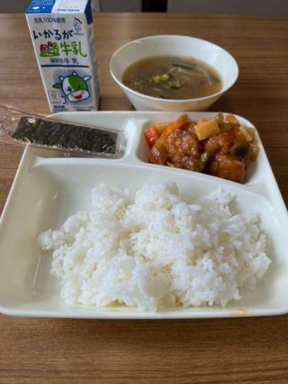 今日の献立は、酢豚、中華みそスープ、焼きのり、ごはん、牛乳です。酢豚は色とりどりの野菜がはいっています。具は、たけのこ、豚肉、にんじん、たまねぎ、ピーマンです。中華みそスープは、赤味噌を使っています。