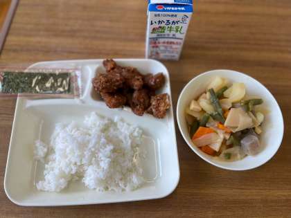 運動会の10月4日の献立は、みそカツ、じゃがいもと野菜の煮もの、焼きのり、ごはん、牛乳です。運動会後もあってどの学年もしっかり食べていました。