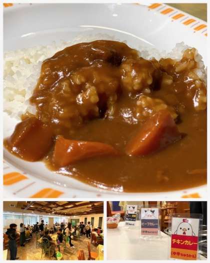 昼食の時間になりました。今日の昼食は【カレーバイキング】です。3種類のカレーライスから、好みの味を選んでおかわりができます。