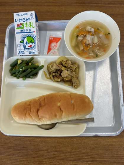今日の献立は、豚肉のカレー風味焼き、鶏肉と野菜のスープ、さんどまめとコーンのサラダ、ノンエッグドレッシング、おさつパン、牛乳です。おさつぱんは、さつまいもが入っているので甘みがあり美味しいです。