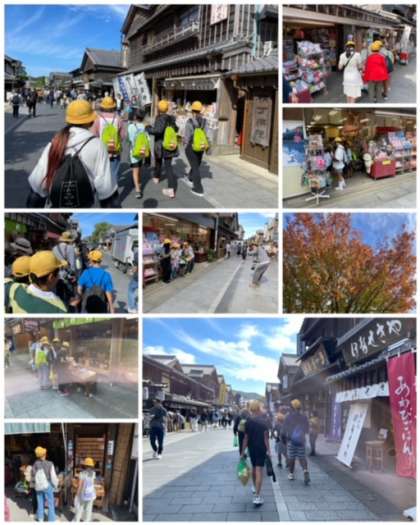 子どもたちは、おはらい町、おかげ横丁でお土産物を見て回っています。江戸時代末期から明治初期にかけての伊勢路の伝統的な街並みを再現するために、歴史的な建物を移設しています。修学旅行は子どもたちの思い出となる行事ですが、同時に学習の場でもあり、街並みを眺めながら歴史についても学べる場所になっています。
