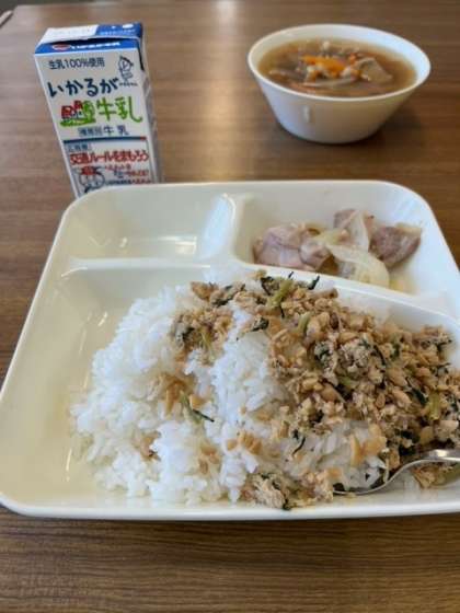 今日の献立は、鶏肉のゆず塩焼き、ソーキ汁、ツナ大豆そぼろ、牛乳です。ツナ大豆そぼろがご米飯にのっていて食が進みます。鶏肉のゆず塩焼きはゆずの香りがして美味しいです。ソーキ汁は、野菜とお肉が入っていて具たくさんです。