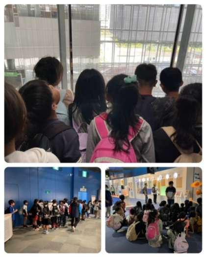 エレベーターで最上階に上がり、グループに分かれて館内の展示を見ます。エレベーターの中からはロボットの姿も見えて、子どもたちの期待も膨らみます。