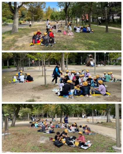 お弁当を食べる広場に到着。グループに分かれて、今からお弁当を頂きます。