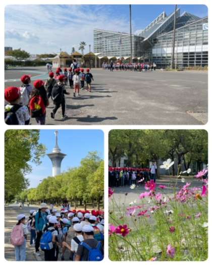 咲くやこの花館に到着。この後、館内を見学します。公園にはとても爽やかな風が吹いています。コスモスも満開で、秋らしい気持ちの良い気候です。