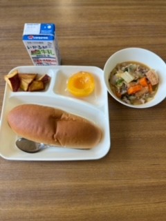 今日の献立は、豚肉といかの中華煮、大学いも、黄桃、パン、牛乳です。豚肉といかの中華煮は、豆板醤を使って豚肉を炒めているので香りがよく美味しいです。にんじん、たまねぎ、はくさい、あつあげ、いか、にらもはいってたくさん野菜を食べることができます。