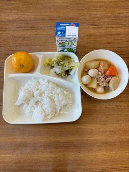 11月2日の献立は、関東煮、はくさいの甘酢あえ、みかん、牛乳、ごはんでした。