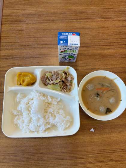 今日の献立は、豚肉と野菜のいためもの、いわしのつみれ汁、かぼちゃういろう、ごはん、牛乳でした。