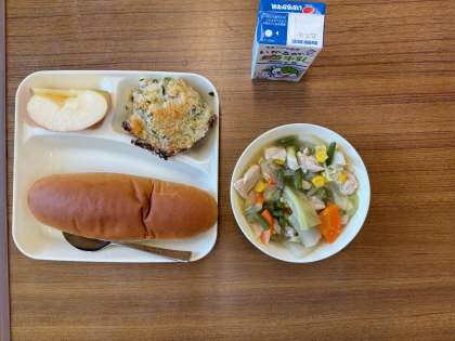 今日の献立は、ほうれんそうのグラタン、スープ煮、りんご、ぱん、牛乳でした。