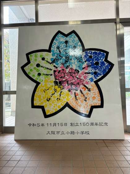 今日は、全校児童によるお祝い集会でした。全校児童で作った掲示物を地域の皆さんや保護者のみなさんにもご披露しました。ひとりひとりの手形で校章の桜の花びらをつくりました。