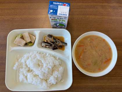 いわしのしょうが煮、みそ汁、高野豆腐の煮もの、ごはん、牛乳でした。