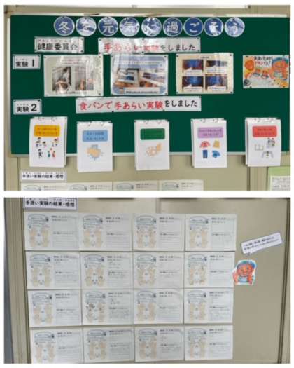 保健室の前では、感染症が流行りやすい時期に合わせて、手洗いの掲示をしています。11月末ごろから、長期間にわたってインフルエンザ等の感染症が流行っています。手洗いを丁寧に行うことが効果的です。