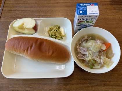 今日の献立は、豚肉と野菜のスープ煮、カレーソテー、りんご、パン、牛乳でした。