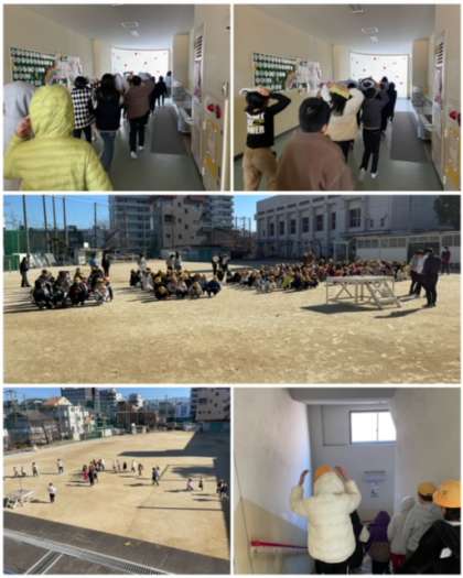 地震発生後に大津波警報が発令された想定で、運動場に避難後に4階に上がります。防災訓練は、いざという時に子どもが身を守る行動を取ることができるようにしておくことが大切です。ご家庭でも、地震が突然やってきた時に、どのように行動すれば良いかをお子さんと話し合っていただければと思います。