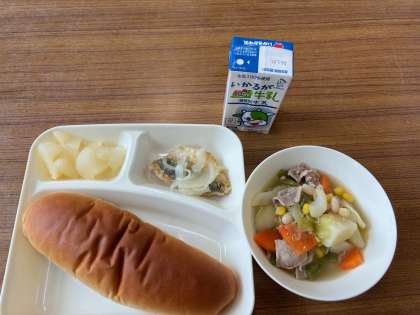 今日の献立は、あじのレモンマリネ、てぼ豆スープ煮、和なし、パン、牛乳でした。