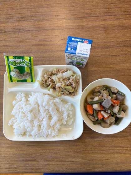 1月29日の献立は、筑前煮、ツナとキャベツのごまいため、まっちゃ大豆、ごはん、牛乳でした。