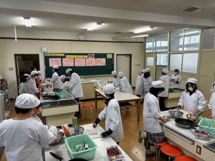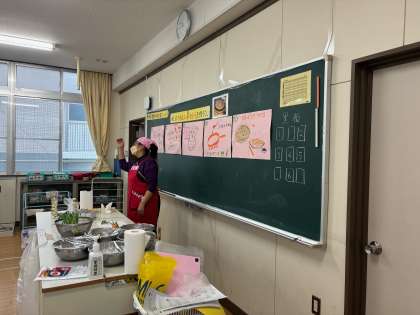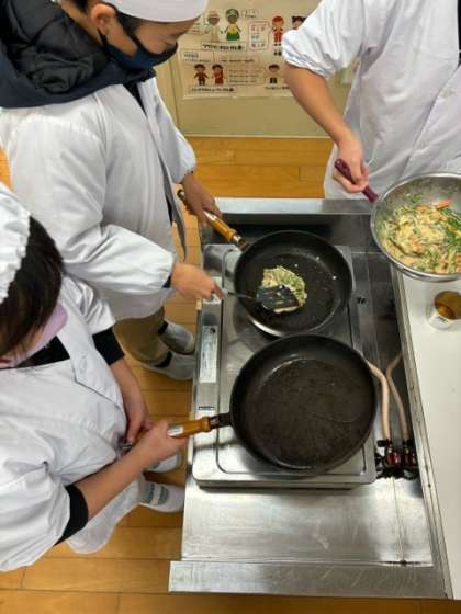 チヂミは、韓国・朝鮮の料理の一つ。雨の日になるとチヂミを食べる習慣があるようです。これはチヂミを焼く音が雨の降る音が似ていて天気が悪いと買い物が大変になるので家に常備した小麦粉と野菜で食事を整えるという意味もあるようです。各班、自分のおすすめの1つを入れていました。「コーン」「さつまいも」「天かす」考えて工夫していました。