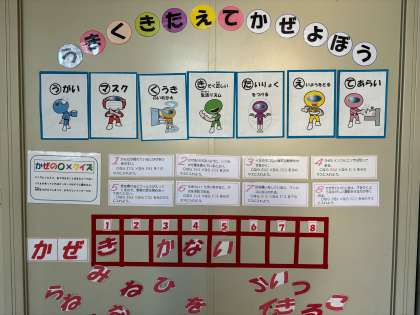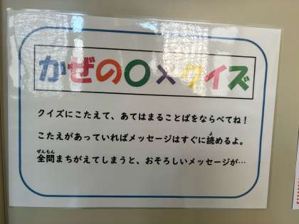 大阪府のインフルエンザ感染も「警報レベル」との報道がありました。保健室の掲示板では風邪予防についてクイズに答えて楽しく学べるようにしています。