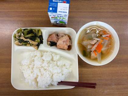 2月16日の献立は、こまつな炊いたん、船場汁、鶏肉のなにわ甘辛ソースかけ、ごはん、牛乳でした。
