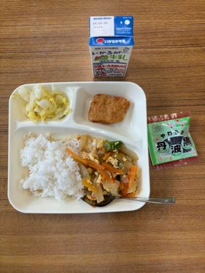 今日の献立は、カツ丼、はくさいの甘酢和え、ソフト黒豆、ごはん、牛乳でした。