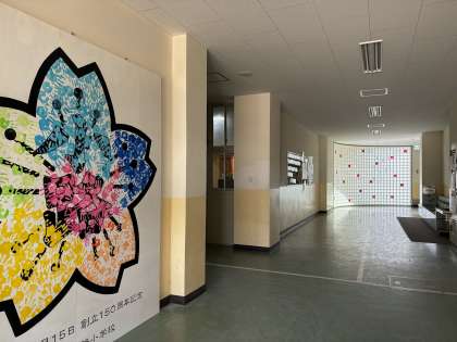 子ども達が作成した作品を管理作業員さんが1階玄関奥の給食室横ガラス扉にて設置してくださいました。
