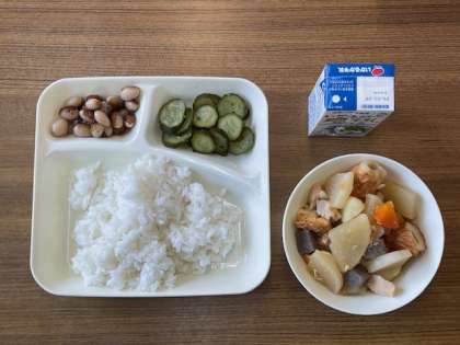 今日の献立は【関東煮・きゅうりの梅風味・とら豆の煮もの・ごはん・牛乳】です。