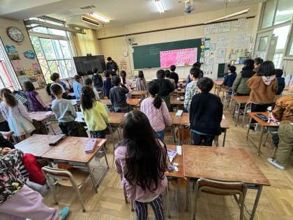 今日の児童朝会で校長先生からお話があったように東日本大震災発生時刻に放送で全校児童で黙祷し弔意表明をしました。