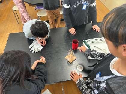 6年生の理科の学習の様子です。煙の動きについて班で観察し話し合っています。