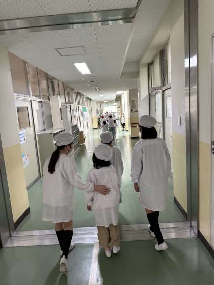今週からいよいよ、1年生が給食室に給食を取りに行きます。重いかごや食缶を運ぶので、しばらくの間は6年生がサポートしてくれています。