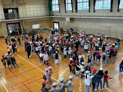 今日は、講堂で児童集会がありました。じゃんけん列車をしました。