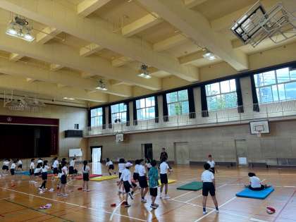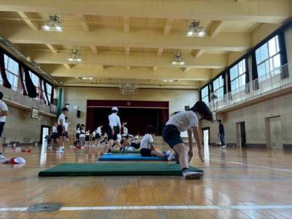 5年体育では、マット運動を学習していました。開脚前転です。脚が床につくとき足を開かないと立つことが難しいです。